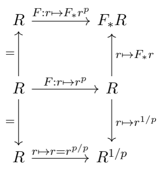 We also concretely looked at $R^{1/p}$ and $F_*R$ in the concrete example where $R=\mathbb F_2[x]$, and saw how these are generated (as $R$-modules) by $\{1,\sqrt x\}$ and $\{1,F_*x\}$, respectively. We saw more generally that when $R= \mathbb F_p[x_1,\ldots, x_n]$, that $F_*R$ is generated by $\{F_*(x_1^{a_1}\cdots x_d^{a_d})\: | \: 0\leq a_i \lt p\}$. We even saw that this generating set is actually a basis! Finally, the following commutative diagram showed us that all three perspectives are really "the same" map. Note that all vertical maps are isomorphisms/equalities, the horizontal maps are all different ways of writing the Frobenius, and the whole bottom row only makes sense when $R$ is reduced.